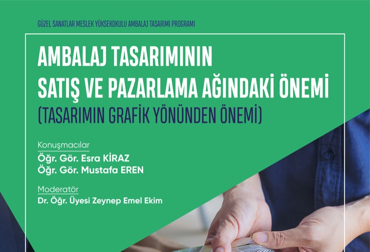 Güzel Sanatlar Meslek Yüksekokulu bünyesinde gerçekleştirilen " Ambalaj Tasarımının Satış ve Pazarlama Ağındaki Önemi" konulu seminer GSMYO Müdürü Dr.Öğr. Üyesi Zeynep Emel EKİM moderatörlüğünde Öğr. Gör. Mustafa EREN ve Öğr. Gör. Esra KİRAZ tarafından 21 Nisan 2021 saat:16:00'da gerçekleştirildi. Gerçekleştirilen seminerde satış ve pazarlama perspektifinden ambalaj tasarımının önemi zengin görsel çeşitliliği ile anlatıldı.